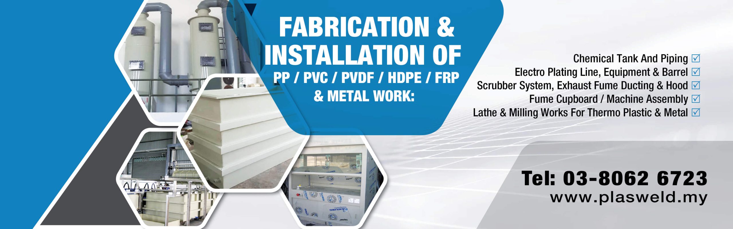 Plasweld Engineering Sdn. Bhd. will design, fabricate, deliver to site, erect and commission the chemical tank, piping, chemical fume extraction system to meet your specifications and requirements. Materials of construction in PP / HDPE / PVC / PVDF / FRP / Stainless Steel / Mild Steel etc.